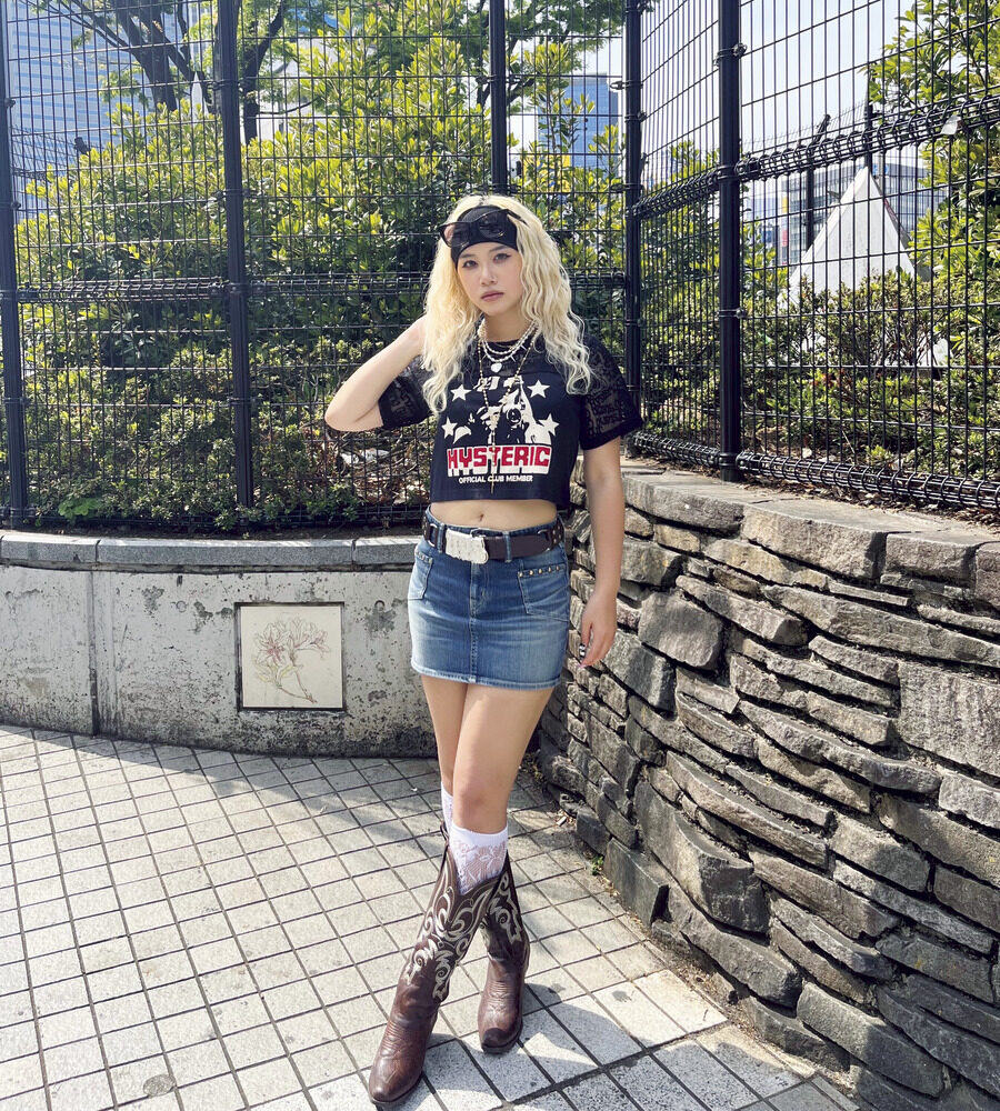 Tシャツ¥15,400、サングラス¥37,400、スカート¥33,000、ベルト¥39,600、アクセサリー¥26, 400/以上すべてヒステリックグラマー、その他/本人私物