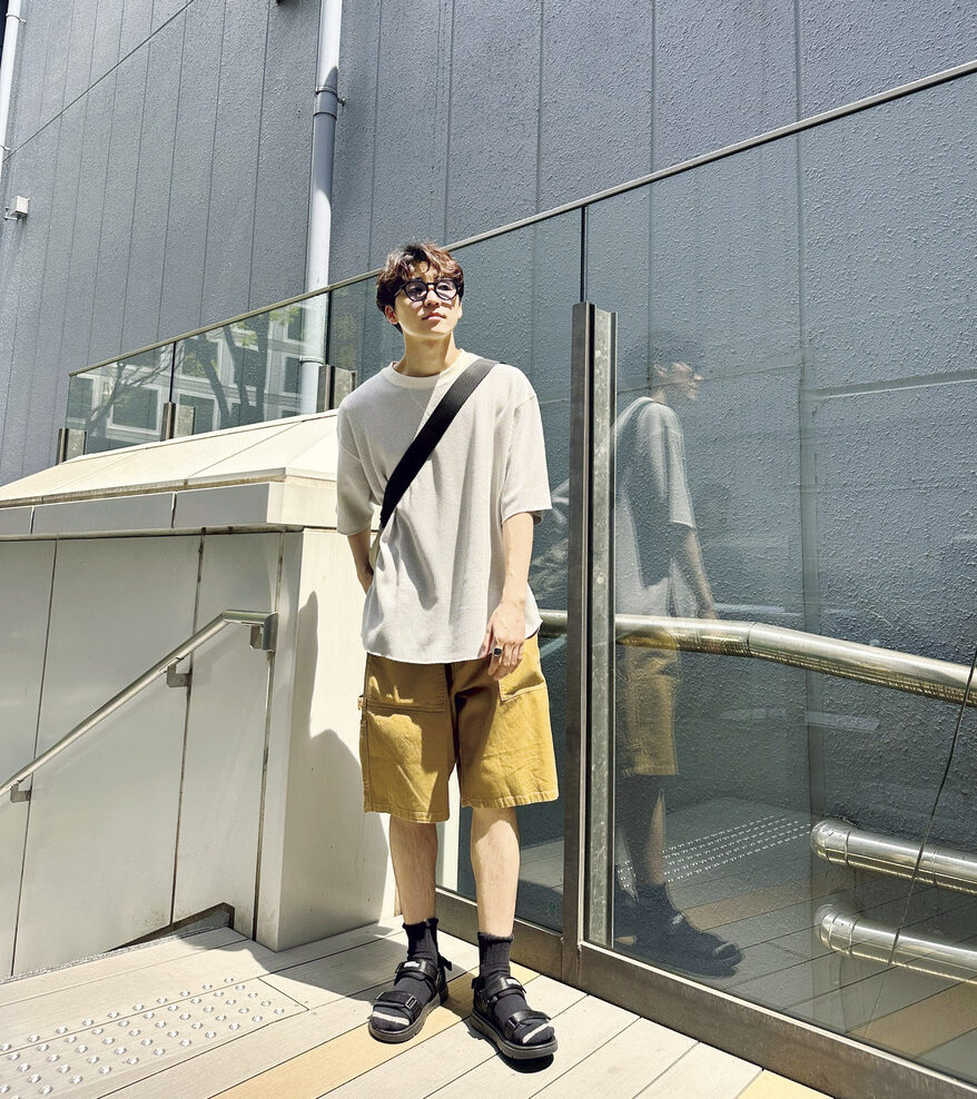 Tシャツ¥4,500、サングラス¥3,960、ハーフパンツ¥6,000、バッグ¥4,400、リング¥3,300、サンダル¥4,400(すべてニコアンド/アダストリア カスタマーサービス)、その他/本人私物