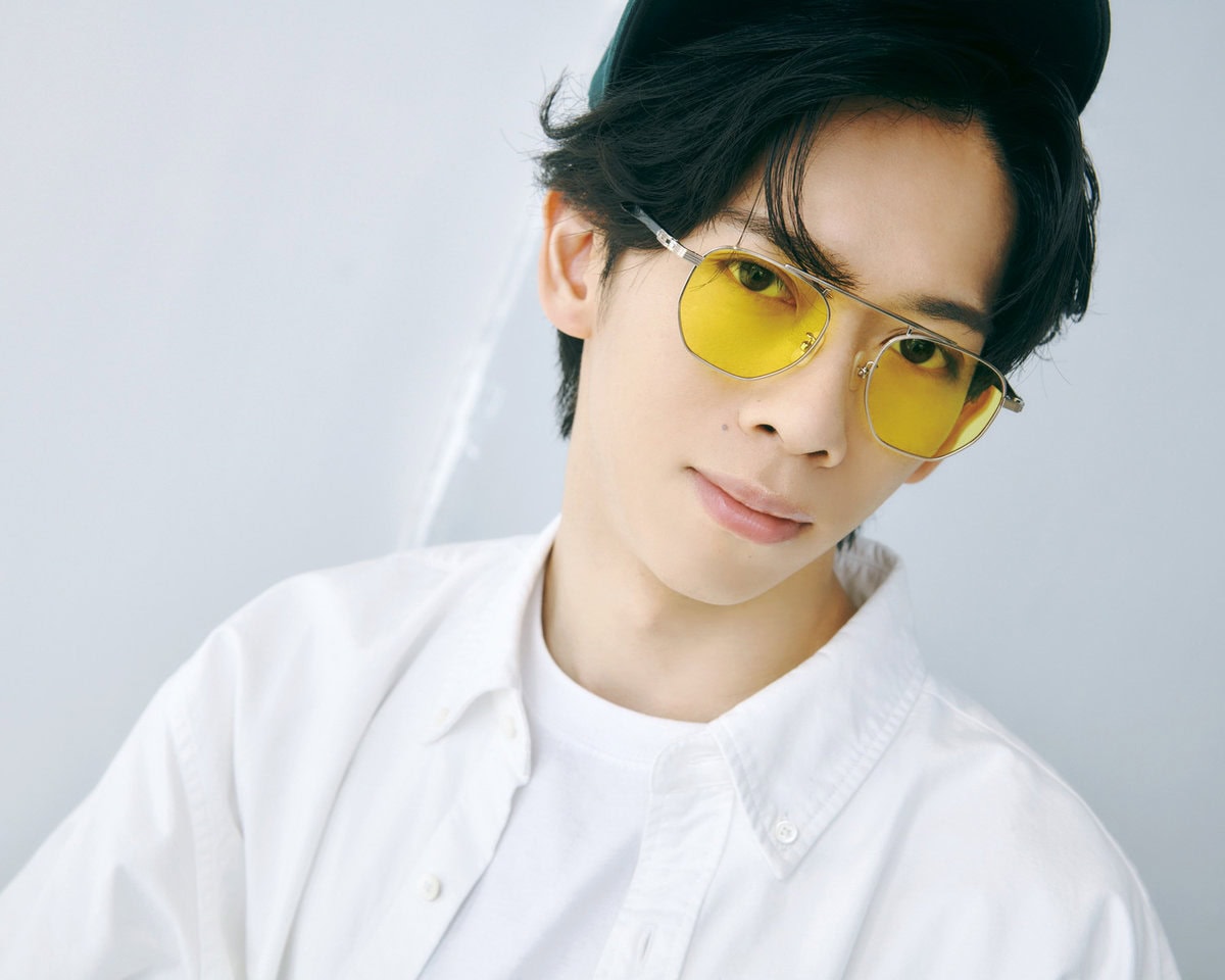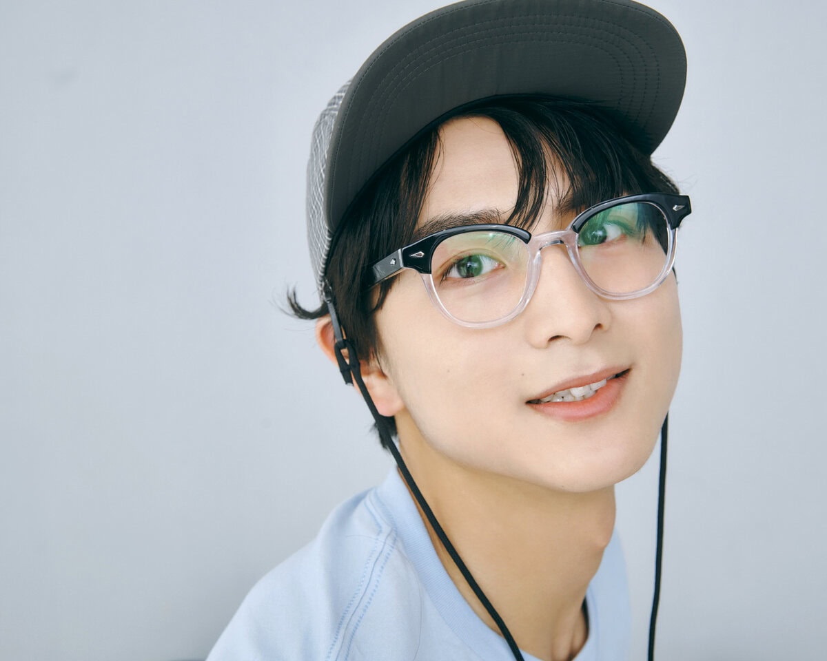【リョウガ】Tシャツ¥6,600/ジャクソン マティス(ハンドイントゥリーショールーム)、メガネ¥29,700/ザ ベッドフォード ホテル(キングスター)、シャツ¥13,200/ビームス(ビームス 原宿)、パンツ¥38,500/グランク(NISHINOYA)、キャップ¥7,000/ザ ファクトリー メイド(中央帽子)、スニーカー¥19,800/リーボック