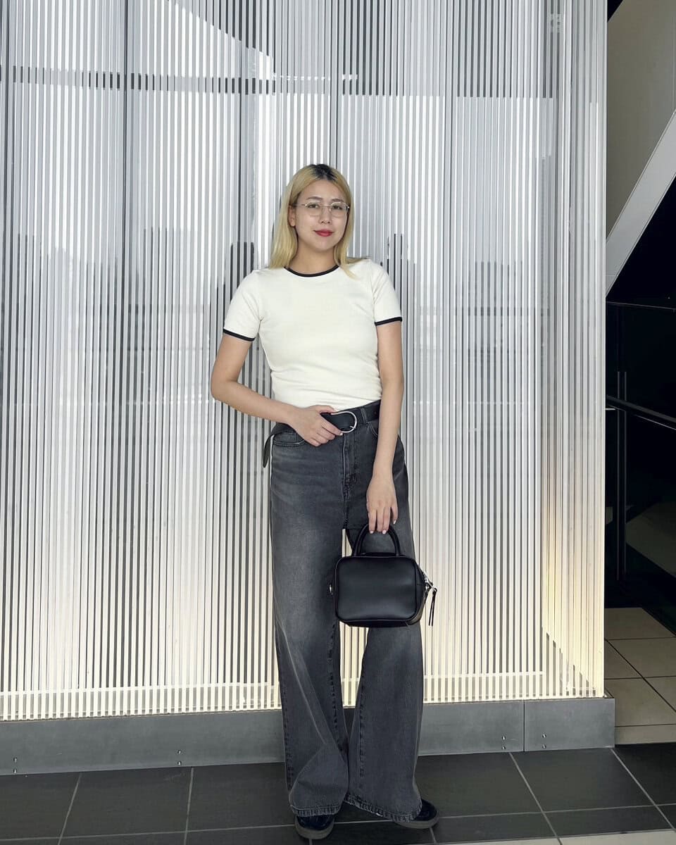 「トップスの印象の強弱で、選ぶフレームを変えています。ボリューム系、襟などにポイントがあるときは細めのメタルフレーム、シンプルシルエットや淡いカラーのトップスのときは、黒が入っているフレームを選ぶことが多いです」