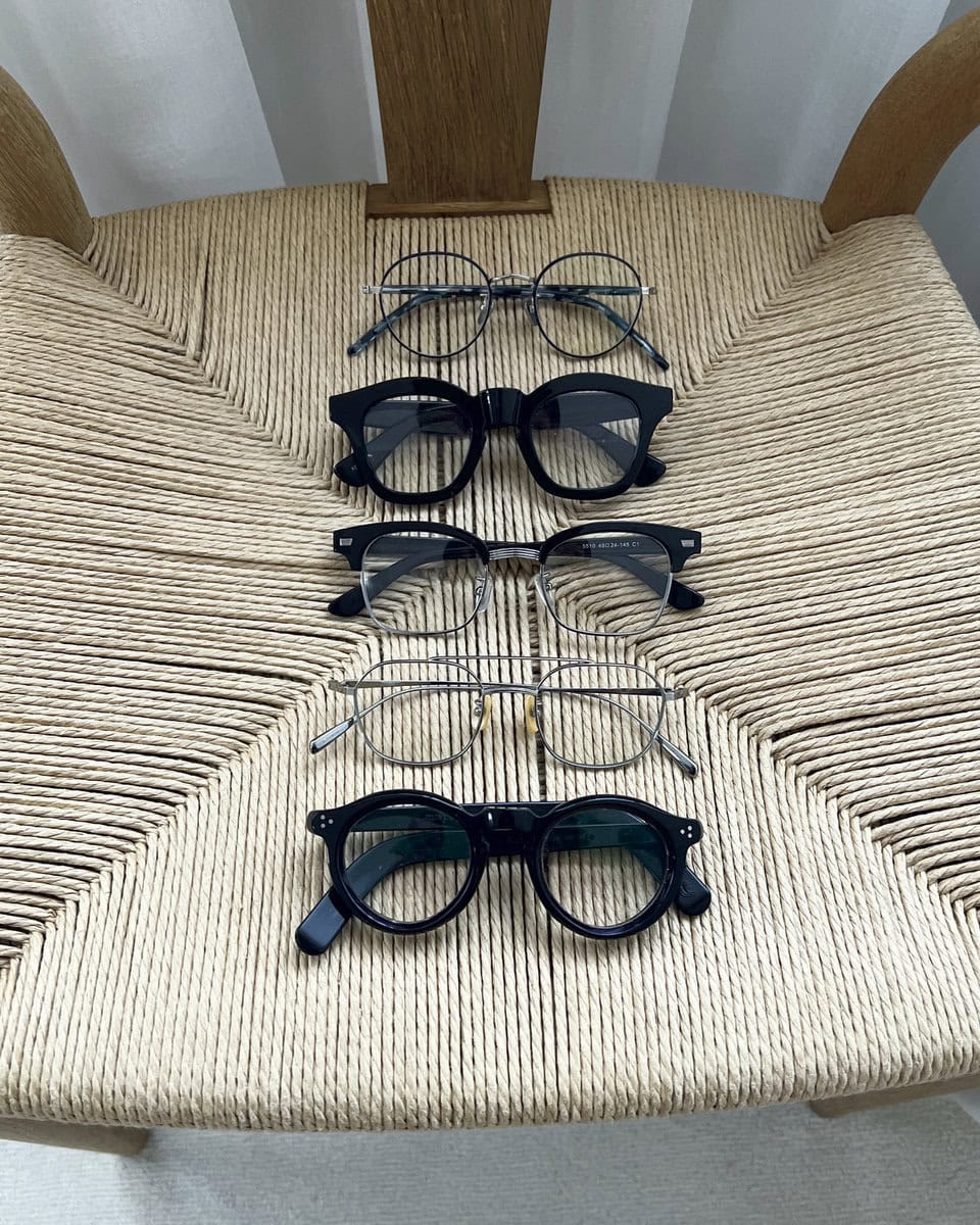 上から:kearny、ノーブランド で1,500円くらいの黒ぶち、韓国の雑貨屋で1,000円程度で購入、BJ CLASSICと、友達の石田一帆ちゃんコラボメガネ、guepard gp-07 で40,700円