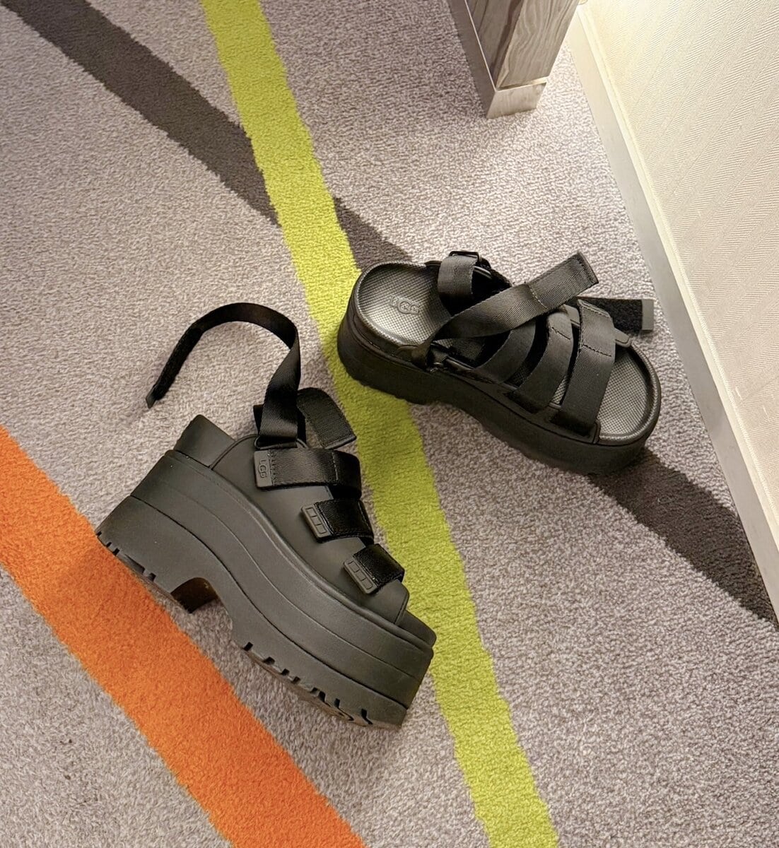 「同じく低身長オタクの友人から“すごいサンダルが出たぞ!”と一報が来た一品。ヒールなんと11.4cm。152cmの私にとって、スタンディングのライブは人権がなさすぎるんですが、これを履いたらやっと人並みの視界が手に入るぞ!と意気込みさっそくUGG店舗へ。厚底なのはうれしいんだけど、見た目めちゃくちゃ重たそうで、買ったけど結局履かない、とはしたくなかったので(¥25,000だし)試着は必須。買う気満々前のめりぎみに店員さんに各色履かせてもらい、歩行もさせてもらってそんなに重たくないことも確認。ベルトのホールド力も申し分ありません。痛くもないし。”合わせやすいベージュが人気ですよ~”と勧められたにも関わらず、やっぱり黒を購入。置いてあると、すっごい黒い塊です。写真はこれを履いて挑んだソウルコンスタンディング終了後、ホテルで撮った1枚。“お前がいなかったら埋もれていたよ”と感謝をこめて。現状ライブ用サンダルです」