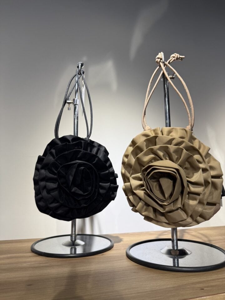 コーデの主役にぴったりなバラモチーフのバッグ! ぱっと見インパクトがあるけど、ベーシックカラーなので合わせやすい♡