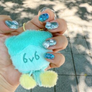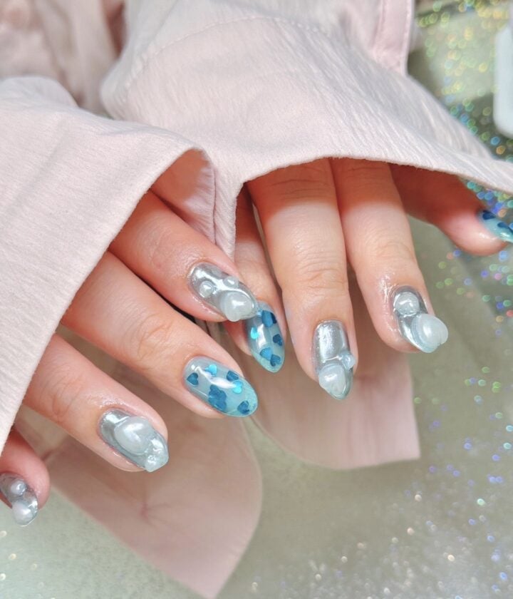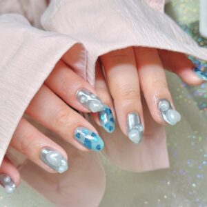 ぷるんと透け感のあるグリーンにハートホロを埋め込んださわやかデザイン。立体感のある白ハートのベースは、グリーンのぴかぴかミラーネイルです。可愛い要素をつめこんで、デビュー日のお祝いを。