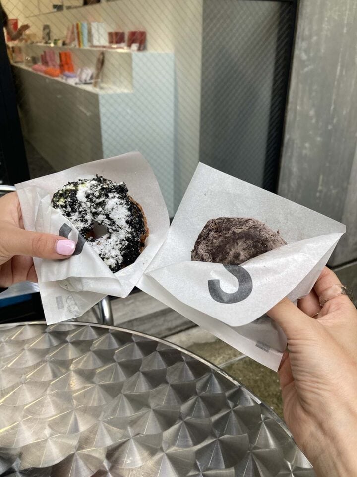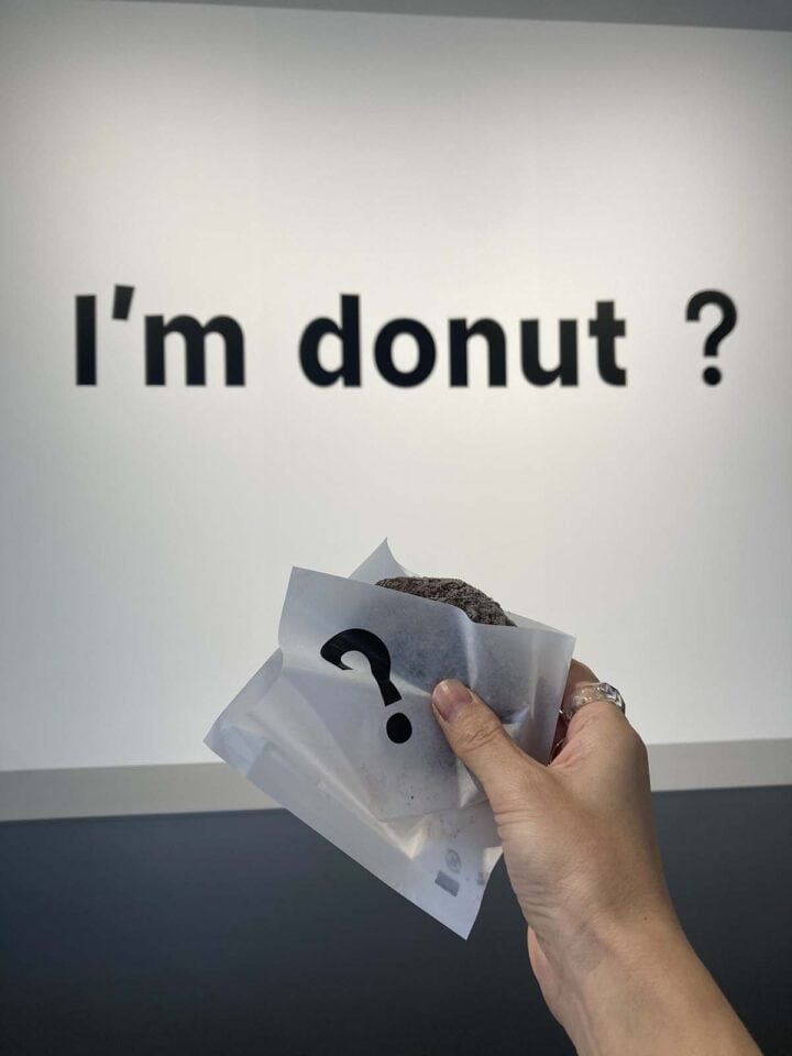 イートインスペースにて。向かって左手に持っているのがソウル店限定の韓国海苔を使った「海苔グレーズド」。まさか⁉の組み合わせと思いきや、海苔のしょっぱさと甘すぎない生地、振りかけられたシュガーがベストマッチ。ぜひ試してみて!